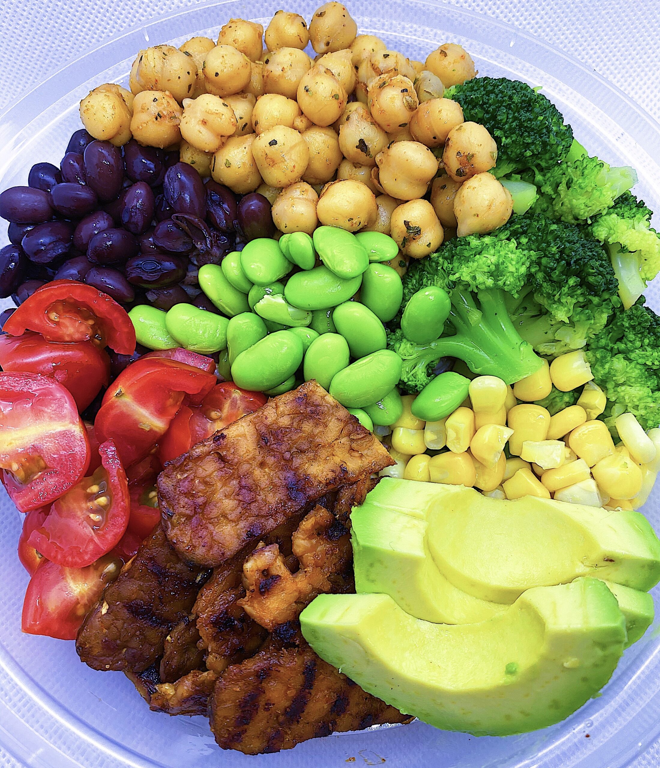 Served with brown rice, broccoli, edamame, and stir fry mixed vegetables