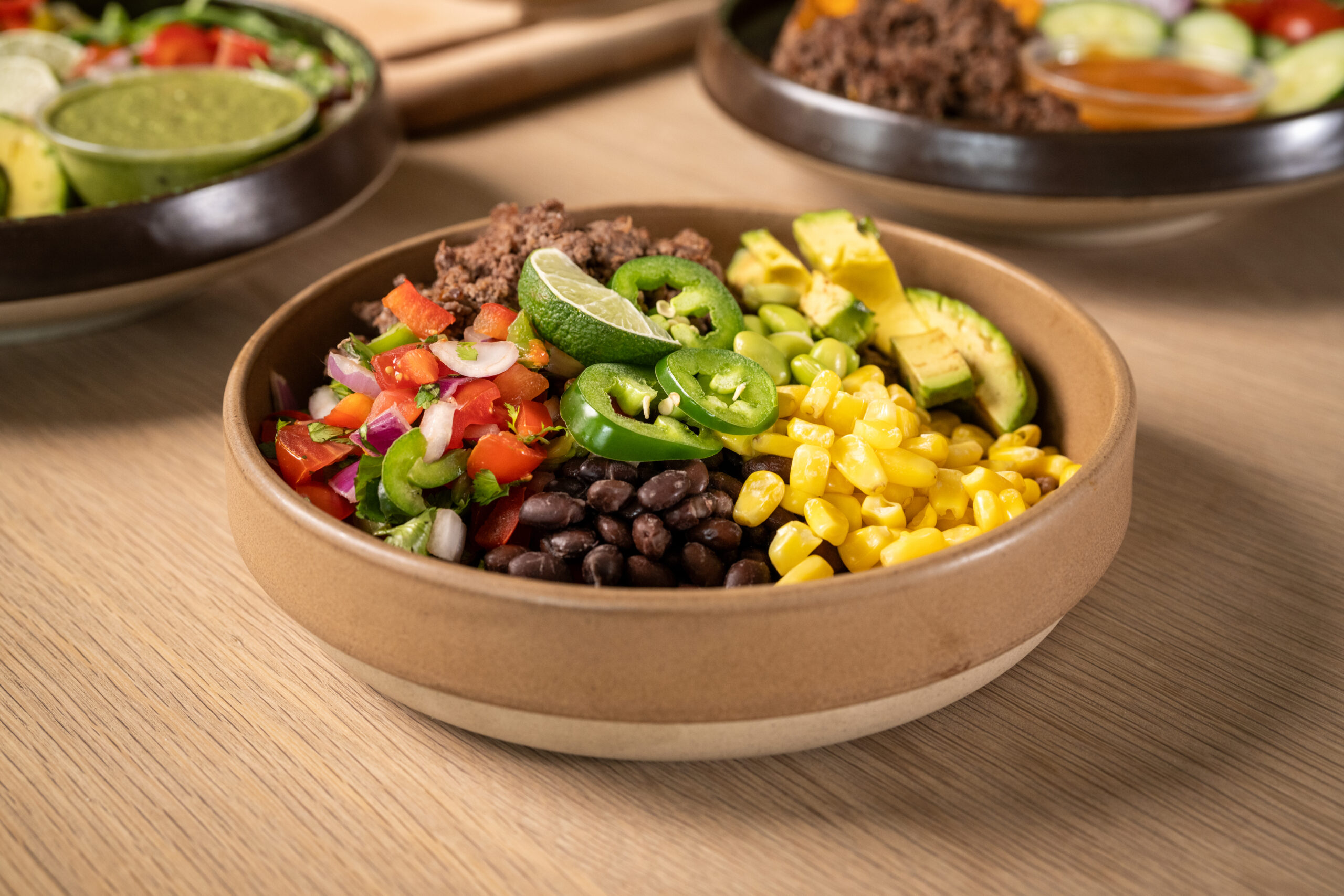 Ground beef served with multigrain rice, edamame, black beans, corn, tomatoes