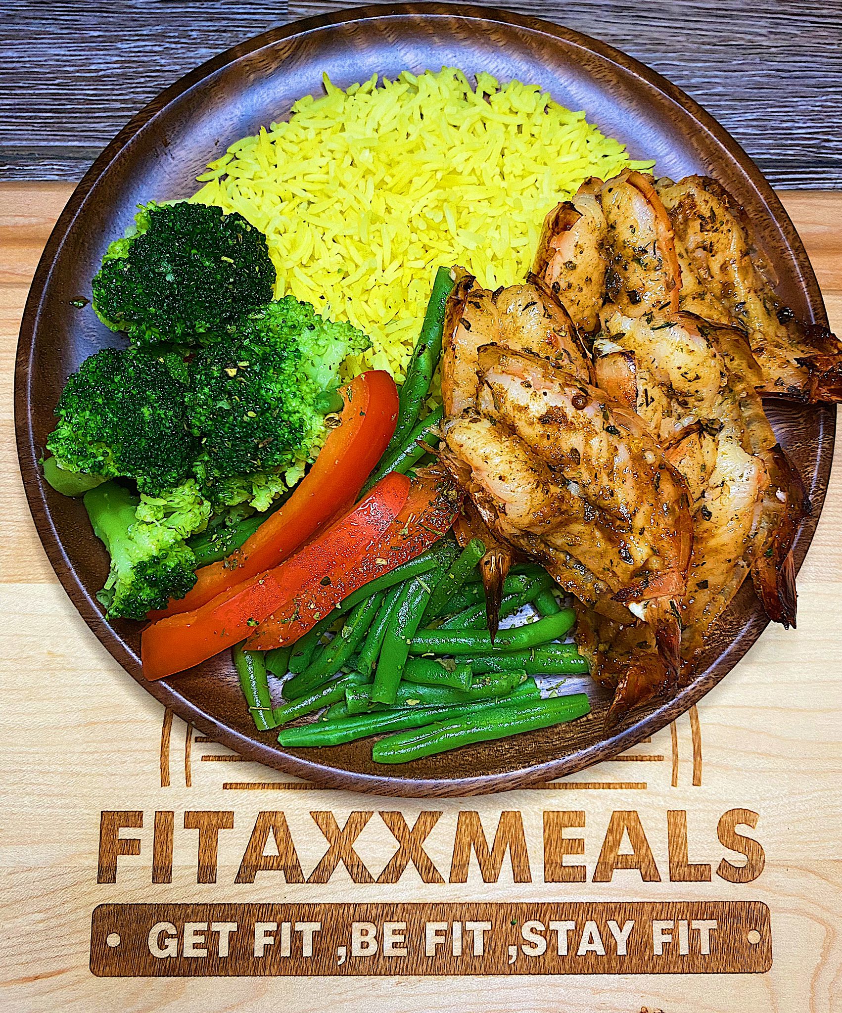 Colossal baked butterfly cajun shrimp with turmeric rice and mixed vegetables