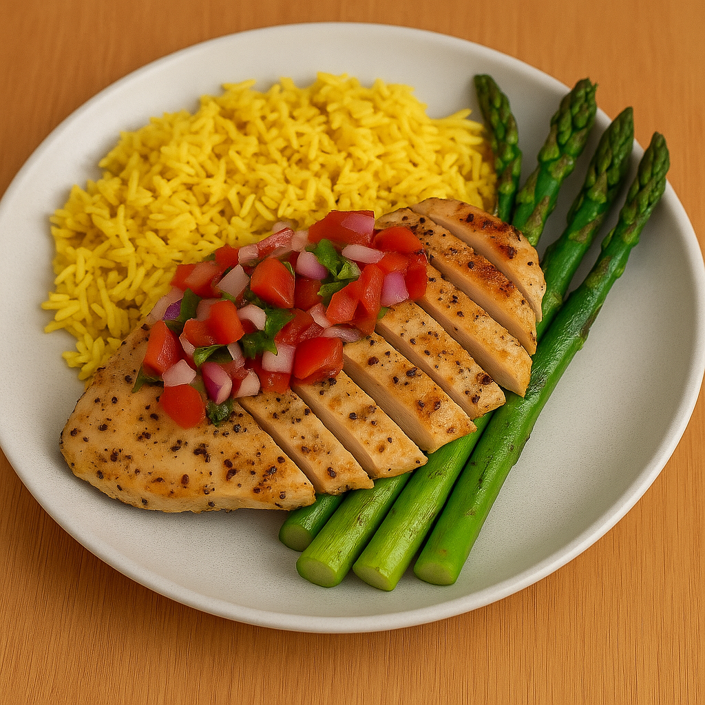 Served with turmeric rice and baked asparagus