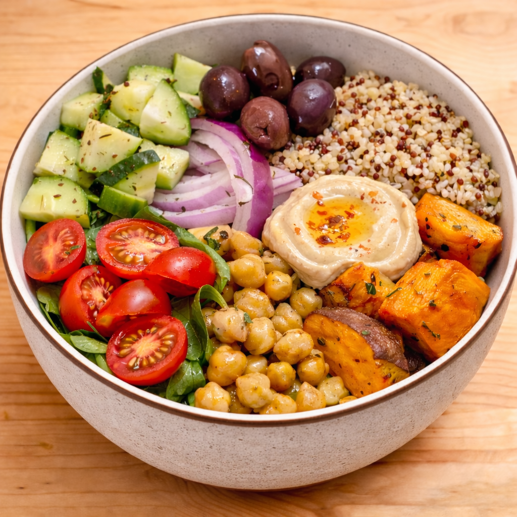 Served with quinoa, roasted sweet potatoes, black olives, cucumbers, tomatoes, chickpeas, and a side of hummus.