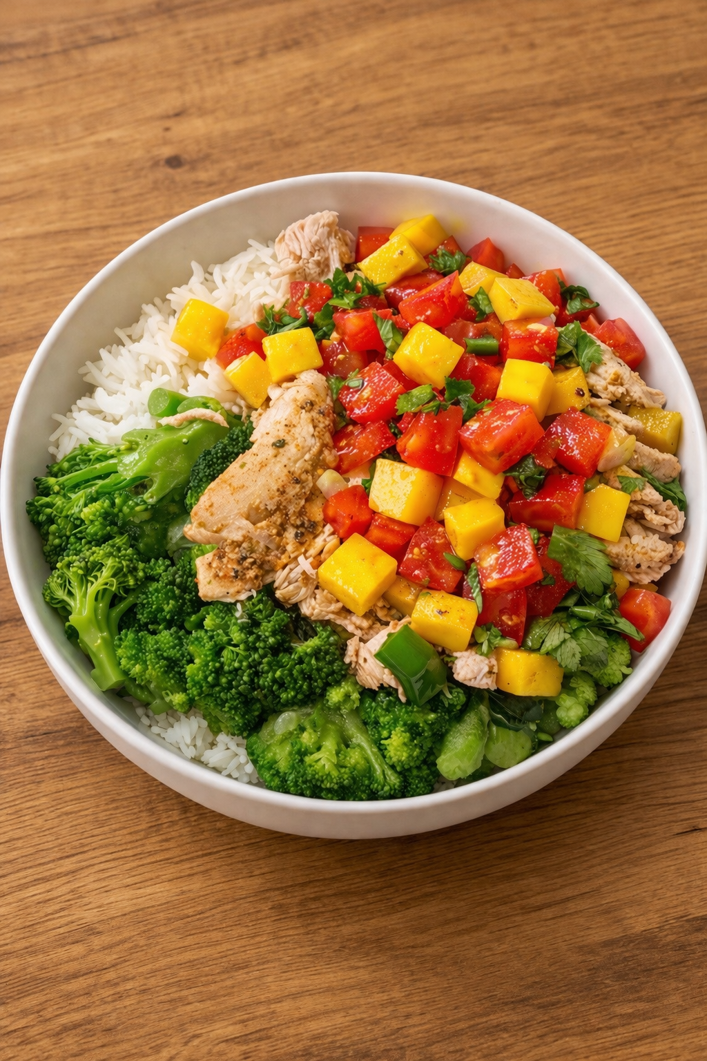 Honey lime chicken served with basmati rice, broccoli, and our home-made mango salsa.