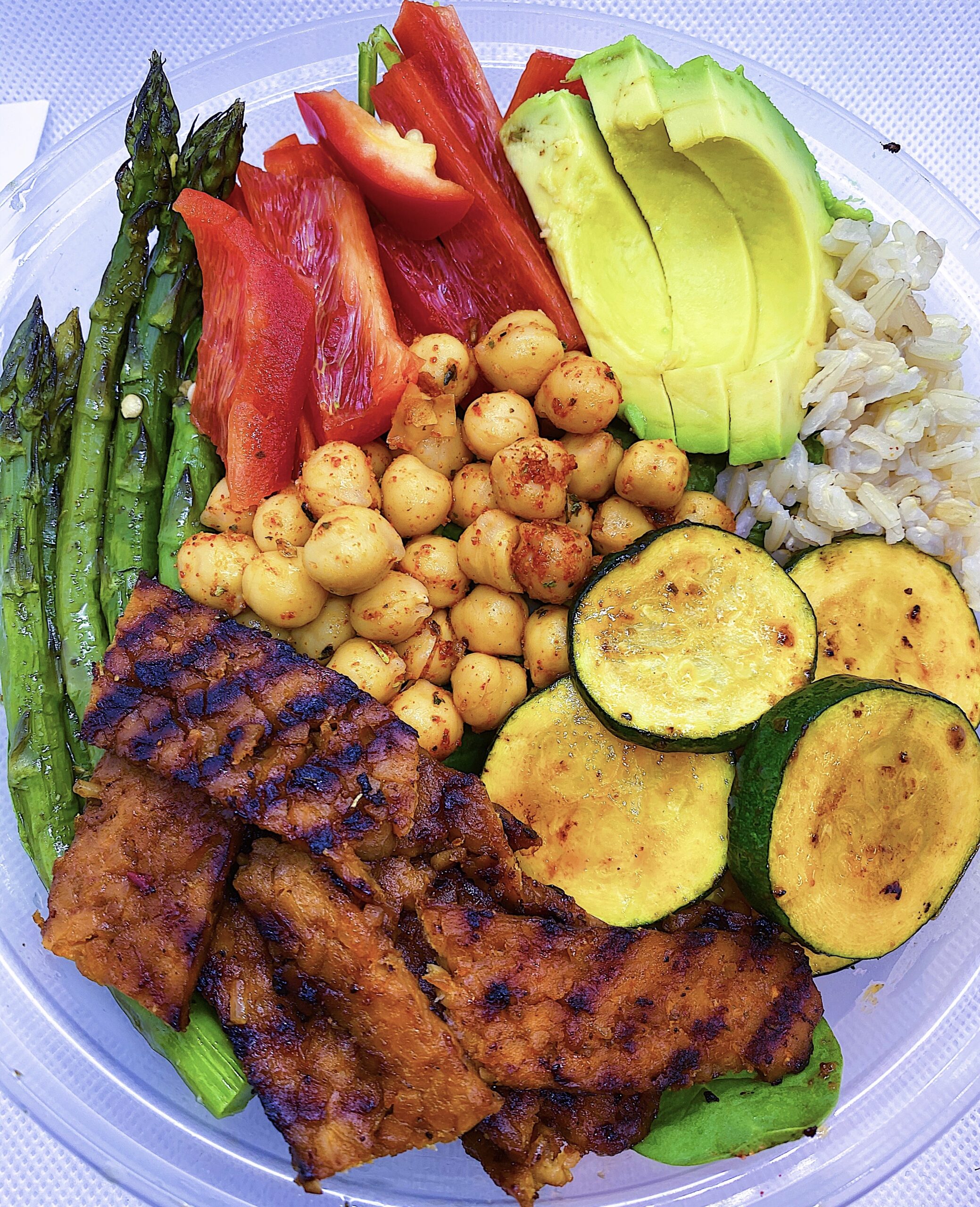 Served with brown rice, asparagus, zucchini, sweet bell peppers, and avocado