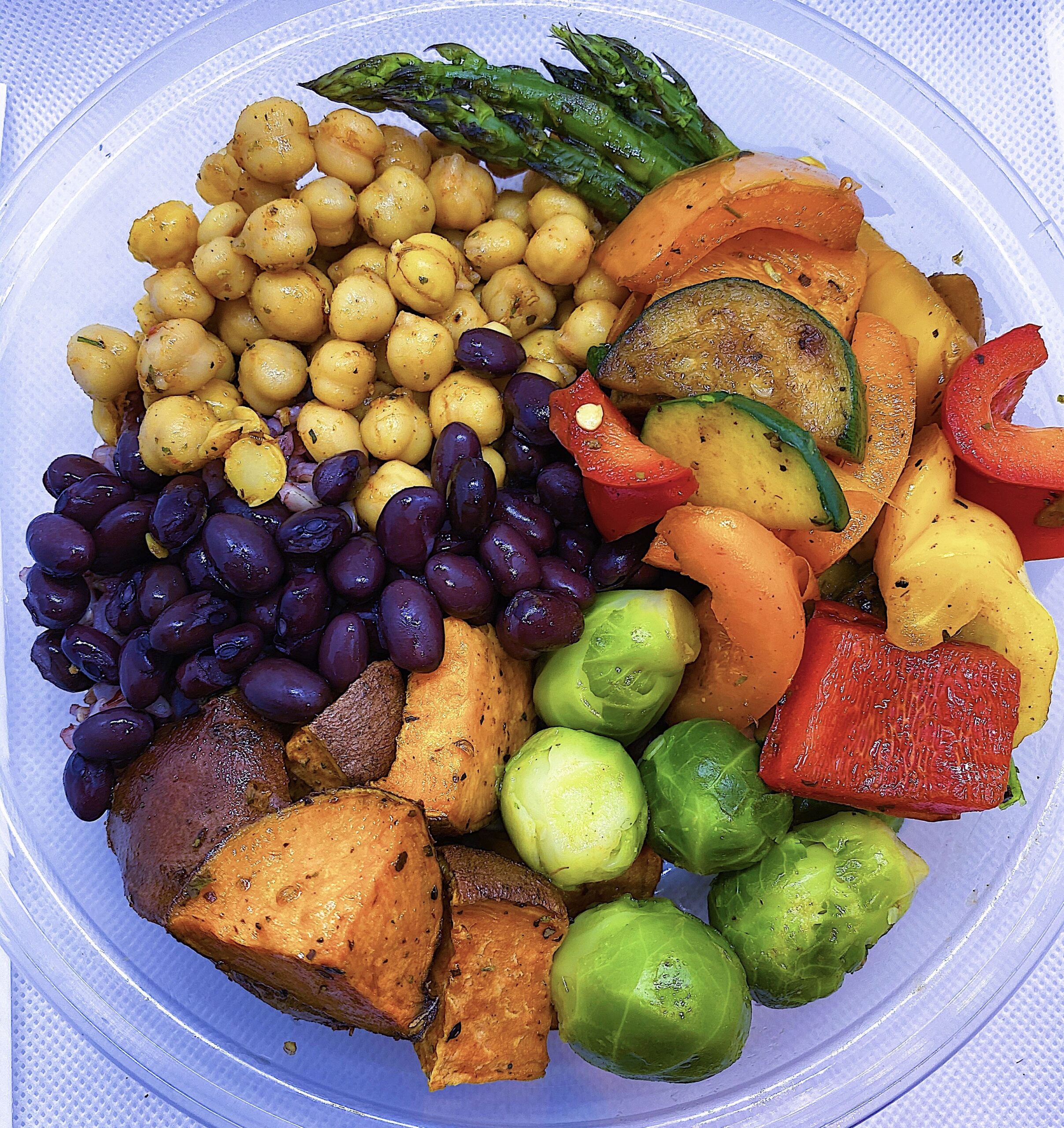 Made with lemon tahini, roasted sweet potatoes, beans, chickpeas, asparagus, and mixed vegetables